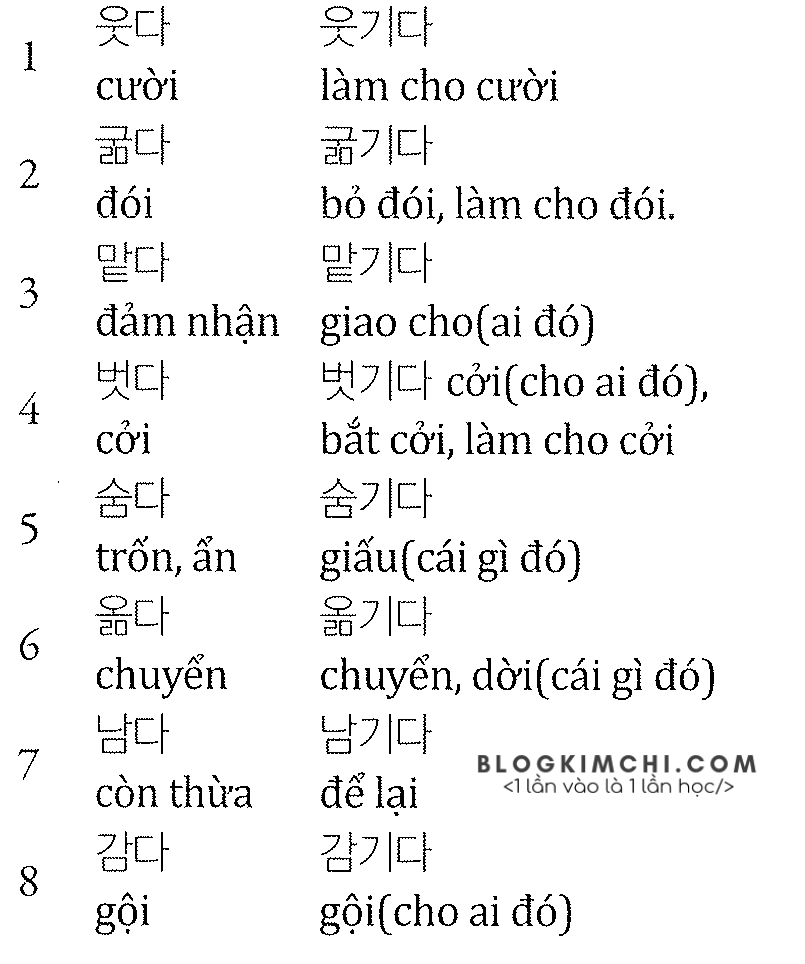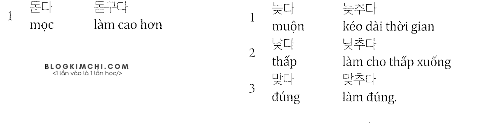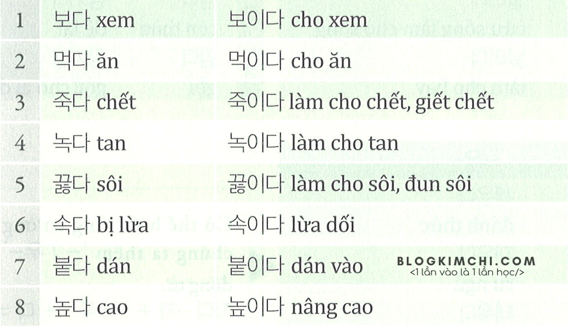 Dạng 1: Gắn vĩ tố -이-, -히-, -히-, 기-, -우,-구-, – 추 -, vào sau một số thân động từ.