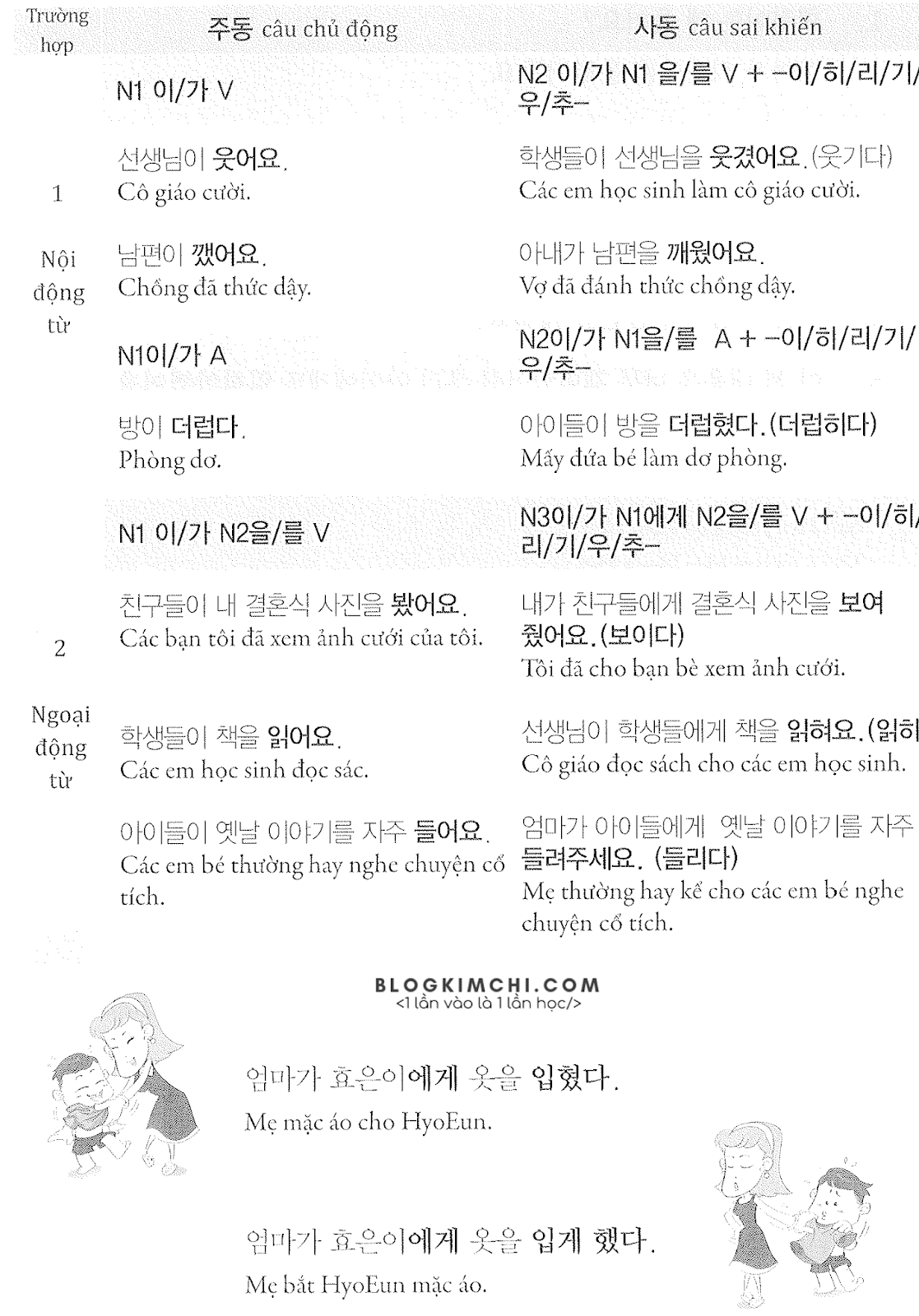 사동사 – Thể sai khiến : Là dạng câu mà chủ thể trong câu làm cho hoặc khiến cho đối tượng khác hành động. Nghĩa trong tiếng Việt :’ “làm cho, bắt, khiến cho..” Hãy cùng tìm hiểu cách chia và ví dụ nhé: