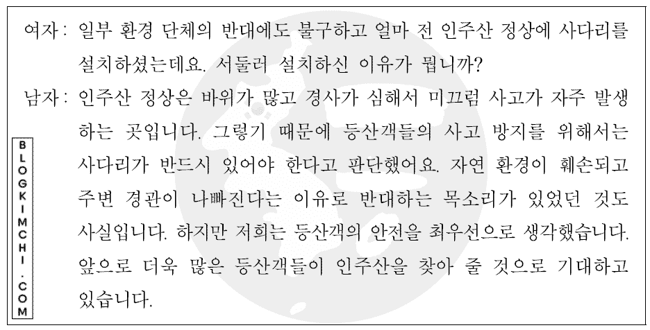 [Nữ]: Mặc dù phía Hội bảo vệ mội trường đã có ý kiến phản đối nhưng tại sao các ông vẫn lắp thang đi bộ trên đỉnh núi Injusan? Lý do gấp rút tiến hành lắp là gì vậy, thưa ông?남자 : 인주산 정상은 바위가 많고 경사가 심해서 미끄럼 사고가 자주 발생 하는 곳입니다.