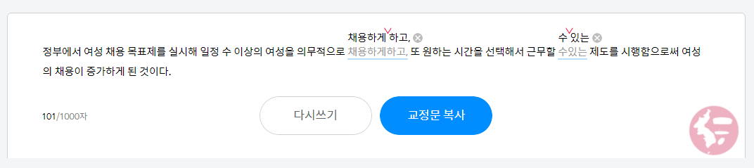 Tóm lại nó sẽ giúp các bạn hoàn thiện một cách hoàn hảo 100% để không bỏ lại bất kì một lỗi “soạn thảo” nào trong bài viết. Rất tuyệt vời phải không nào @@ Các bạn hãy xem hình ảnh minh họa như bên dưới nhé, đoạn văn này có 2 lỗi và nó đã chỉ ra cho bạn. Nếu bạn muốn Coppy lại cả đoạn văn đã được sửa thì chỉ cần nhấp vào 교정문 복사 sẽ tự động được sao chép lại và chỉ cần Ấn dán/ Paste vào chỗ đang cần là được. Link web/tiện ích này mình để bên dưới nhé các bạn.