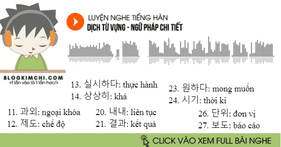I. Nội dung bài nghe 서울의 고등 학생 가운데 반 이상이 과외를 하고 있고, 한 달 평균 과외 비용은 25만 원인 것으로 조사되었습니다. Hơn một nữa trong số học sinh tiểu học ở Seoul đang tham gia ngoại khóa, và theo điều tra thì một tháng trung bình phí ngoại khóa là 250000 won. 김정수 기자의 보도 입니다. Đây là báo cáo của phóng viên Kim Choeng Su 최슨 한 연구소가 서울의 고등 학교 남학생 1,200명을 대상으로 조사한 것을 보면 3학년 학생 가운데 49%, 2학년 학생 가운데 52.8%가 과외 수업을 받는 것으로 나타났습니다. Dựa trên số liệu điều tra của bộ điều tra Seoul trên đối tượng là 1200 học sinh nam của trường trung học Seoul thí có 49% học sinh năm 3, 52.8% học sinh năm 2 đang học ngoại khóa. 서울 고등 학생의 반 이상이 과외를 하고 있는 셈입니다. Tính ra thì hơn nữa học sinh trung học Seoul đang học ngoại khóa 지역별로는 강남구와 서초구 같은 강남 지역 학생들은 69%가 과외를 받고 있으나, 노원구와 중랑구 같은 강복 지역 학생들은 39%밖에 안 되어 지역에 따라 차이를 보였습니다. Tùy theo khu vực mà nhìn thấy điểm khác nhau như ở Khu vực Phía Nam sông Hàn như quận Socho và quận Kang Nam là những khu vực đặc biệt thì có 69% học sinh học ngoại khóa, tuy nhiên Ở khu vực phí bắc sông Hàn như quận Chungrang và quận Nowon thì tỷ lệ không ngoài 39%. 한 달 과외 비용은 평군 25만 원으로, 고등 학교 3개월 등록금 15만 2천 원에 비하면 상당히 많은 편입니다. Phí ngoại khóa một tháng là 250000 won, nếu so với 152000 won là học phí 3 tháng học của trường trung học thì khác nhiều. 또 이 금액은 도시 근로 자의 한 달 월급의 23%가 되므로 과외비가 심각한 문제가 된다는 것을 알 수 있습니다. Thêm vào đó là lệ phí này gần 23% tiền lương một tháng của người lao động thành phố nên nótrở thành vấn đề nan giải của một số hộ gia đình. 실제로 50% 이상의 부모가 과외를 시키는 것이 힘들다고 말했습니다. Trên thực tế là có hơn 50% phụ huynh cho rằng để con học ngoại khó là thêm vất vả. EBC, 김정수였습니다. (KIM CHOENG SU, Đài EBC, ) II. Từ vựng trong bài