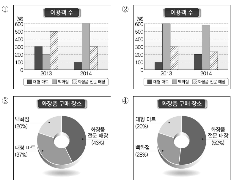 남자: 30대 여성을 대상으로 화장품 구매 장소를 조사한 결과 화장품 전문 매장을 가장 많이 이용하는 것으로 나타났습니다. 그 다음으로는 백화점과 대형 마트가 뒤를 이었는데 백화점 이용객은 지난해에 비해서 크게 줄어든 것으로 조사되었습니다.