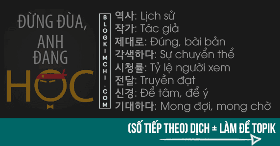 여자: 그냥 드라마일 뿐이잖아. 재미있게 만들려고 내용을 좀 각색했겠지. Thì chỉ đơn giản là phim thôi mà. Để nội dung thú vị thì nội chuyên cũng chắc phải chuyển thể. 남자: 역사 드라마는 시청률보다 역사적인 사실 전달에 더 신경 써야 할 것 같아. 시청자들이 기대하는 것도 그런 거 아닐까? Tôi nghĩ phim lịch sử nên chú trọng nhiều hơn vào truyền đạt giá trị lịch sử hơn là vào tỷ lệ người xem. Và người xem cũng không phải đang mong đợi điều đó sao? 여자: 그 말도 맞는데, 시청자가 원하는 건 역사 공부가 아니라 재미야. Điều đó cũng đúng nhưng mà khán giả thích sự thú vị hơn là học lịch sử ấy..
