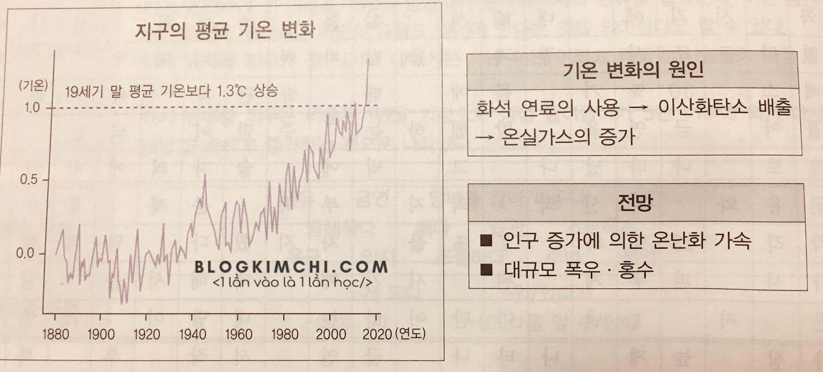 1. 특히 지난 50여 년 동안 지구의 평균 기온은 급격하게 상승했으며, 19세기 말 평균 기온에 비하면 1.3 ℃ 나 상승했다.