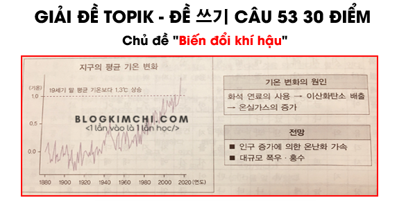 III. Bài viết hoàn thiện 지구의 기온은 매년 상승하고있다. 특히 지난 50년 동안 지구의 기온은 급격하게 상승했는데 19세기 말 평균 기온에 비하면 1.3℃ 나 상승한 것이다. 이러한 기온 상승에 큰 영향을 미치는 것이 바로 온실 가스인데, 온실 가스의 주성분 인 이산화탄소를 배출하는 화석 연료를 현재와 같이 계속 사용한다면 지구의 기온 상승로 인한 문제는 더욱 심각해질 것이다. 인구가 증가함에 따라 자구의 온난화는 더욱 빠른 속도로 진행될 것이고, 그로 인해 대규모의 폭우와 홍수도 발생할 수있다 Nhiệt độ trái đất đang tăng lên hàng năm. Đặc biệt, trong 50 năm qua, nhiệt độ trung bình của Trái đất đã tăng mạnh và tăng 1,3 độ C so với nhiệt độ trung bình vào cuối thế kỷ 19. Khí nhà kính có ảnh hưởng lớn đến sự nóng lên này, khí nhà kính có thành phần chính là khí cacbondioxit – khí thải khi sử dụng các nguyên nhiên liệu hóa thạch nếu cứ tiếp tục sử dụng thì vấn đề nhiệt độ tăng sẽ càng trở nên nghiêm trọng hơn. Khi dân số tăng lên, sự nóng lên của dân số sẽ tiến triển với tốc độ nhanh hơn, dẫn đến mưa lớn và lũ lụt. Các bạn xem cách viết quy chuẩn bài viết trên giấy thi: