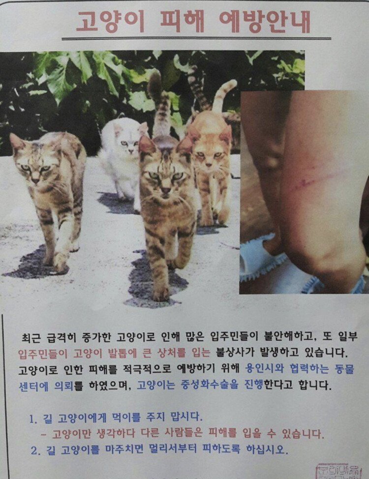 최근 급격히 증가한 고양이로 인해 많은 입주민들이 불안하고, 또 일부 입주민들이 고양이 발톱에 큰 상처를 입는 불상사가 발생하고 있습니다. 고양이로 인한 피해를 적극적으로 위해 용인시와 협력하는 동물 센터에 의뢰를 하였으며, 고양이는 중성화 수술을 진행한다고 합니다. 1. 길 고양이에게 먹이를 주시 맙시다. – 고양이만 생각하다 다른 사람들은 피해를 입을 수 있습니다. 2. 길 고양이를 마주치면 멀리서부터 피하도록 하십시오.